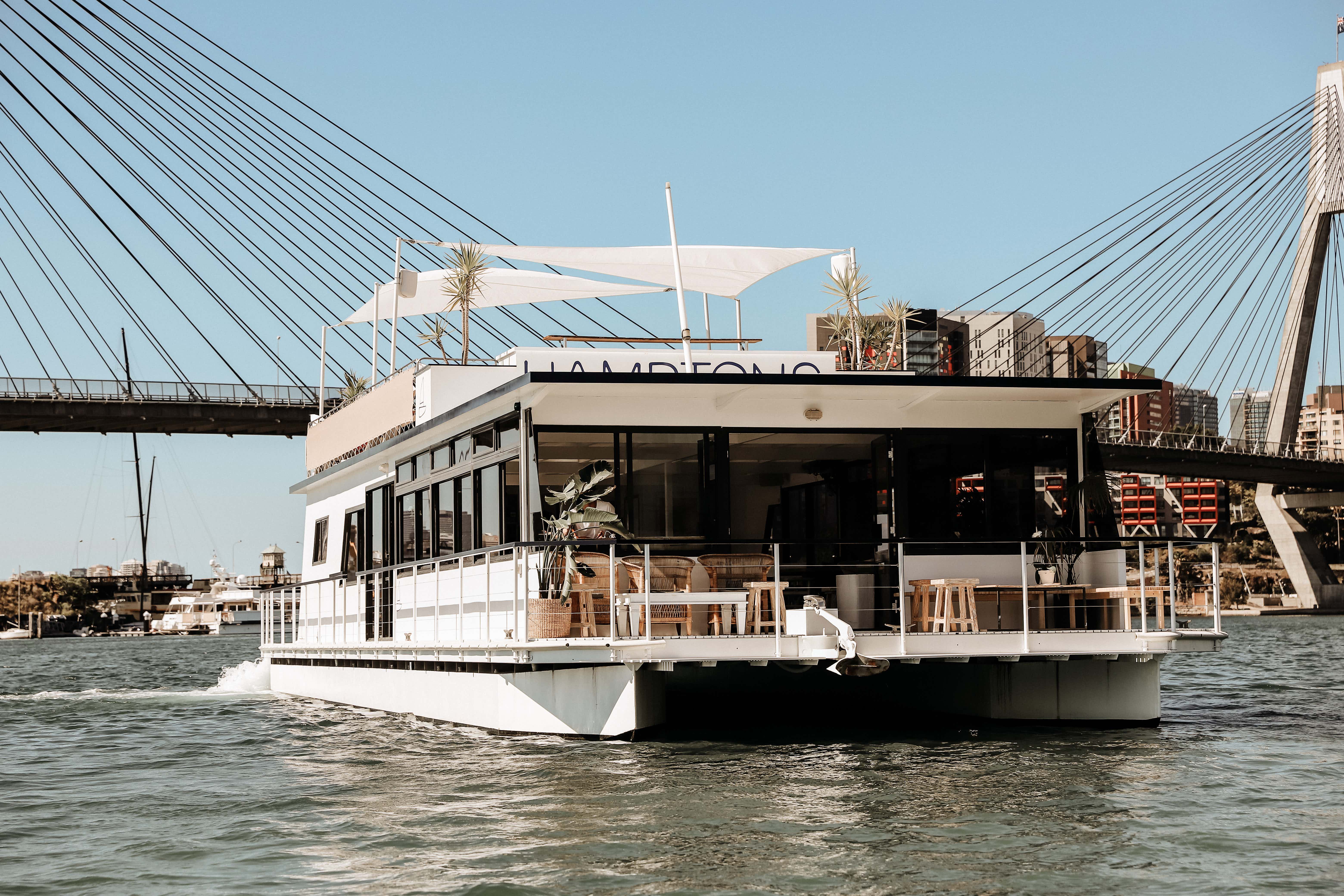 Hamptons Sydney is a purpose-built pontoon vessel, designed for large groups split over two levels. Having two hulls and a wide beam of 7m gives ample space for Vivid Sydney boat parties with up to 95 guests.